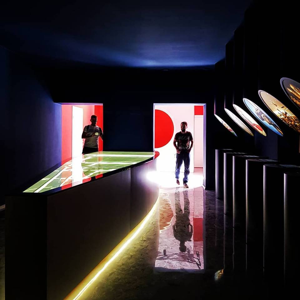 Интерактивная проекционная инсталляция с элементами видео-мэппинга, расположенная в торце главного зала — множество иллюминаторов, в которых видны туристические объекты калужской области.